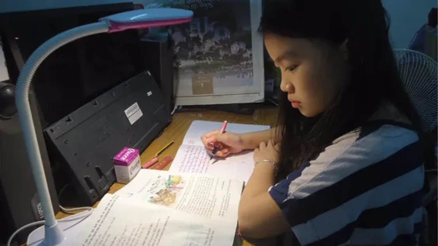 Áp lực học tập, thường xuyên thức khuya là một trong những lý do khiến các bạn nhỏ dễ bị mụn trứng cá